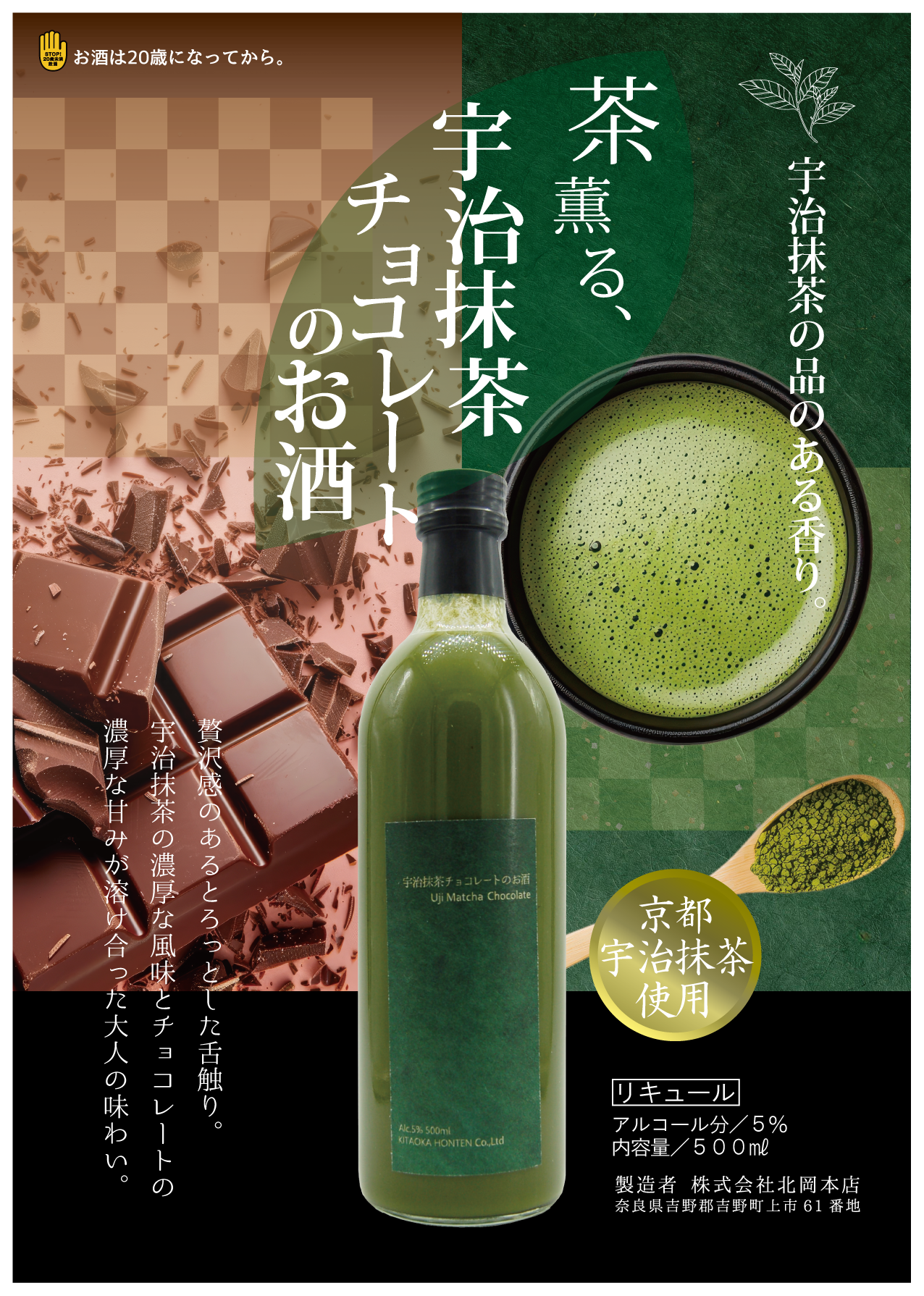 宇治抹茶の上品な香りと、とろりとした贅沢な口当たり。濃厚な抹茶の旨みとチョコレートの甘みが溶け合う、大人の味わいのリキュール。